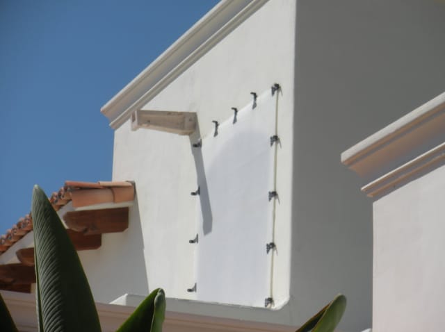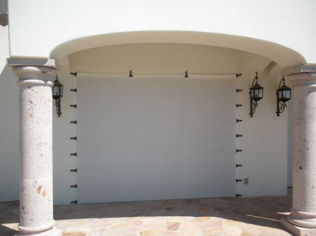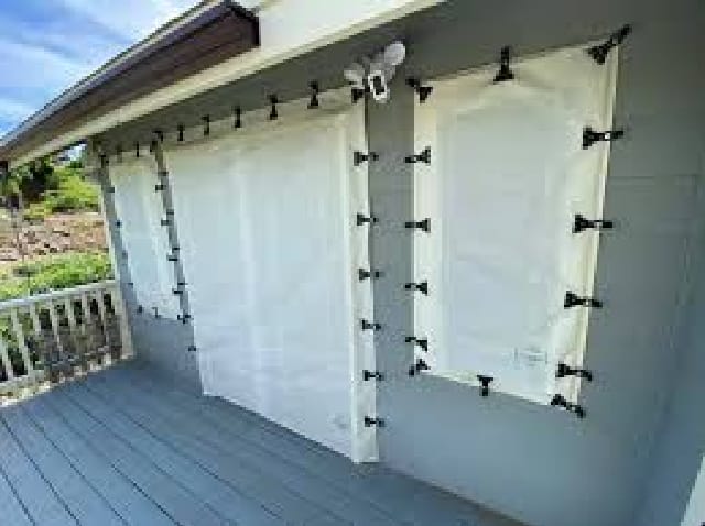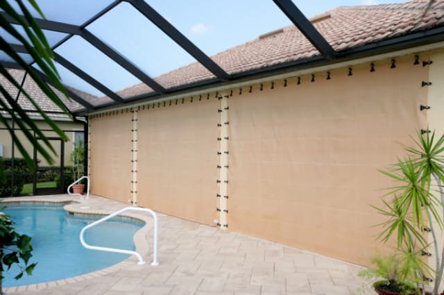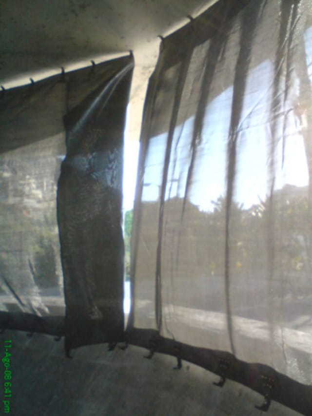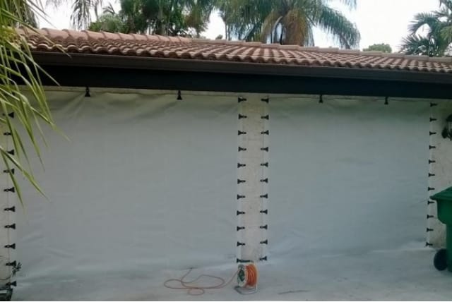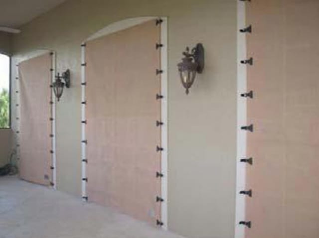 Flexible plastic clips add flex to the system which allows the fabric to decelerate objects more effectively than other screen systems on the market today. Constructed of a technologically advanced, lightweight polypropylene fabric which is 95% solid and 5% porous, it allows natural light and visibility while effectively eliminating high winds and driving rain.